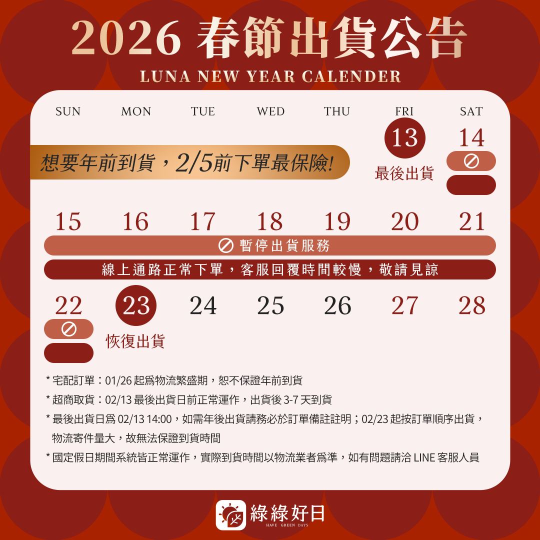 新春檔期物流繁盛期間,物流恕無法指定配送日,實際出貨時間請以後台訂單追蹤顯示為主。