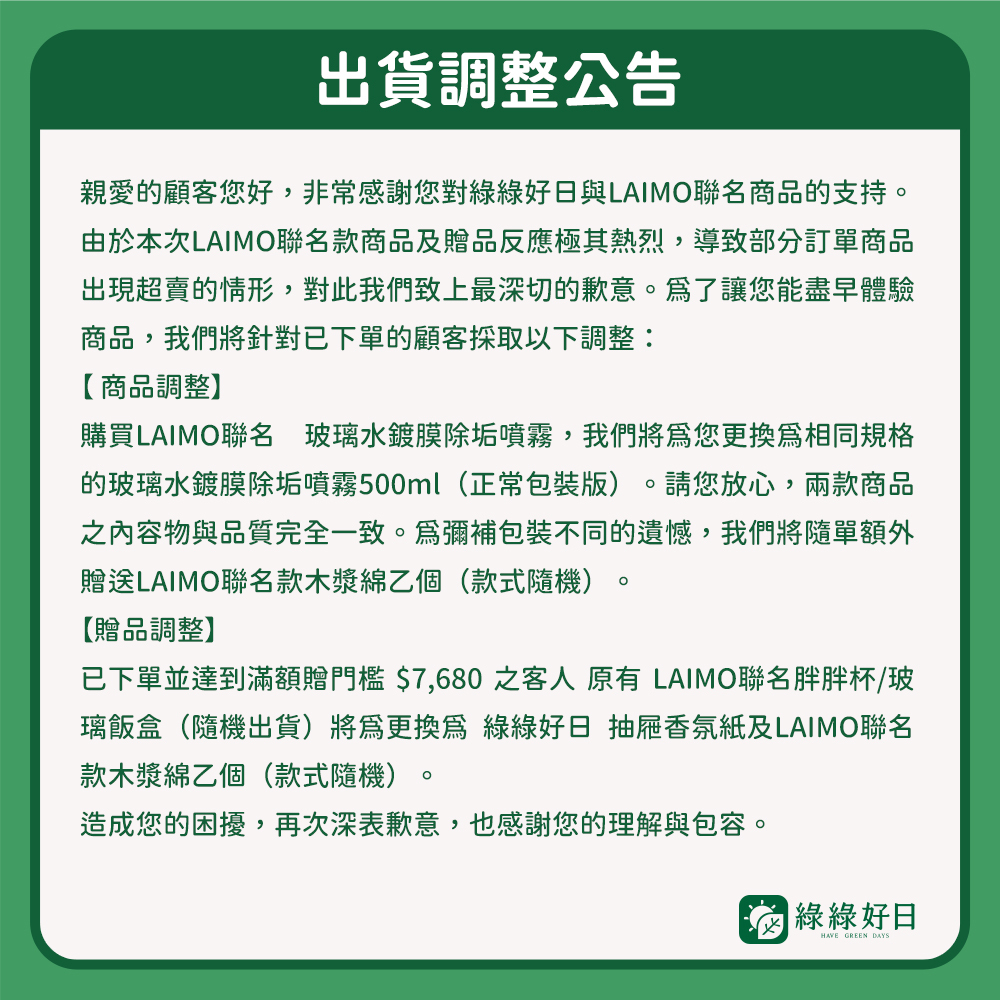 親愛的顧客您好, 非常感謝您對綠綠好日與LAIMO聯名商品的支持。