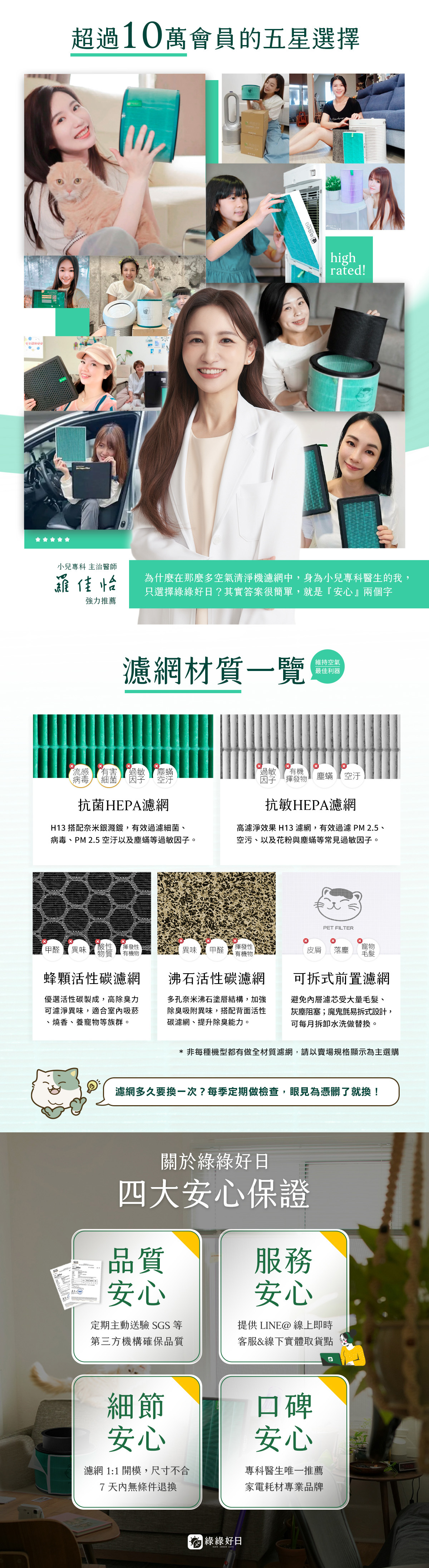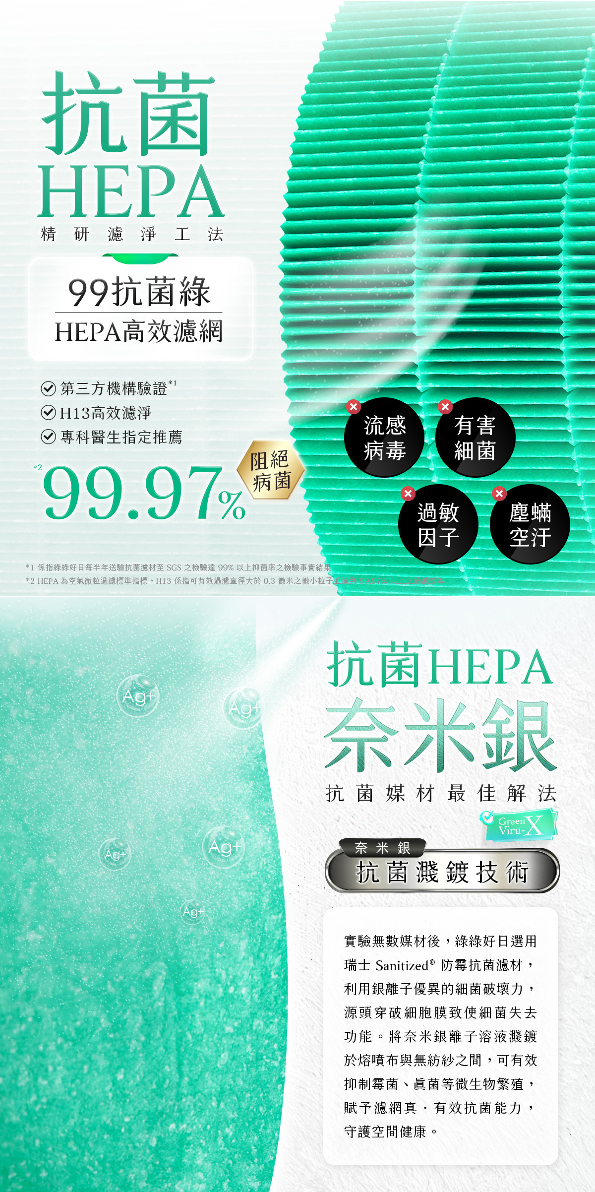 🟢 強效抗菌 HEPA 濾芯:H13 高效『99抗菌綠』實證有效抗菌抗病毒,適合所有安心居家環境