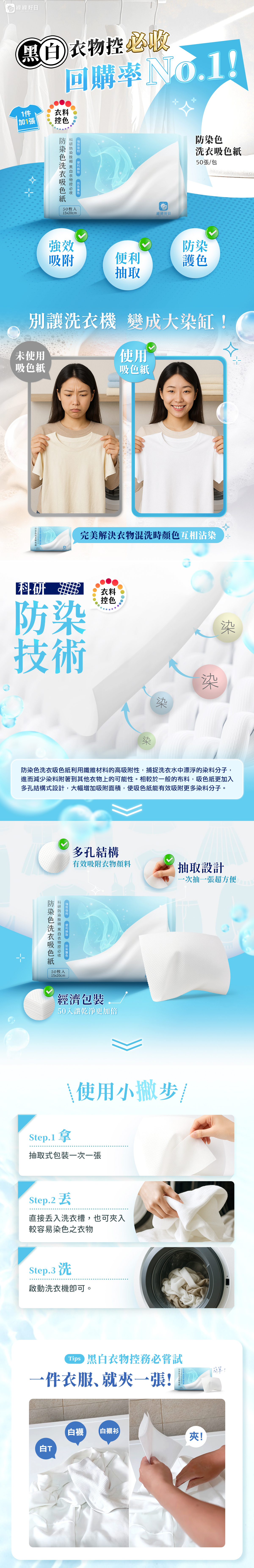 ・已經吸附顏色之吸色紙產品效果將下降,因此不建議重複使用 ・使用前請仔細閱讀衣物標籤和洗衣機說明 ・本產品不適用於牛仔類靛青染色、氨綸(萊卡)、或是任何已染色衣物 ・首次使用時,如不確定衣物的染色情況,建議增加使用量・本產品不適用洗衣機快洗模式以及浸泡功能・本產品僅適用於機洗 ・請避免放置於陽光直射、高溫、潮濕或易燃物品附近 ・請勿將產品丟入馬桶 ・如有誤食,請立即飲水並就醫