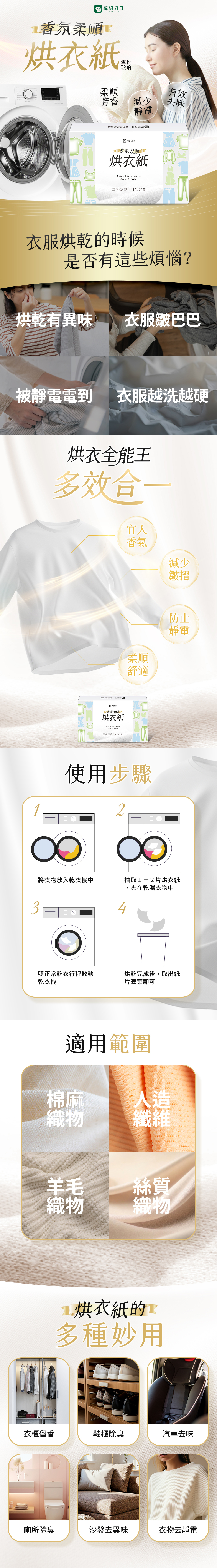 A:可以。烘衣紙能讓纖維更柔順,烘完的衣物更柔軟、不粗硬。