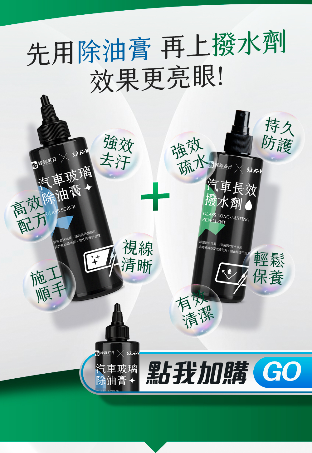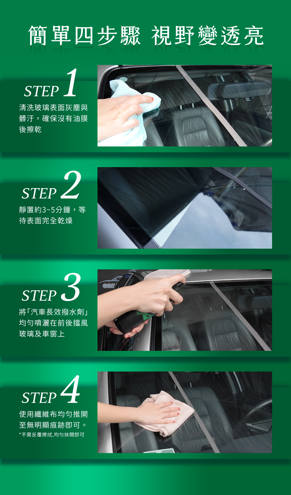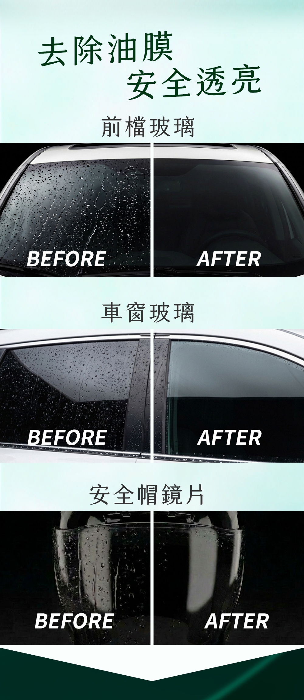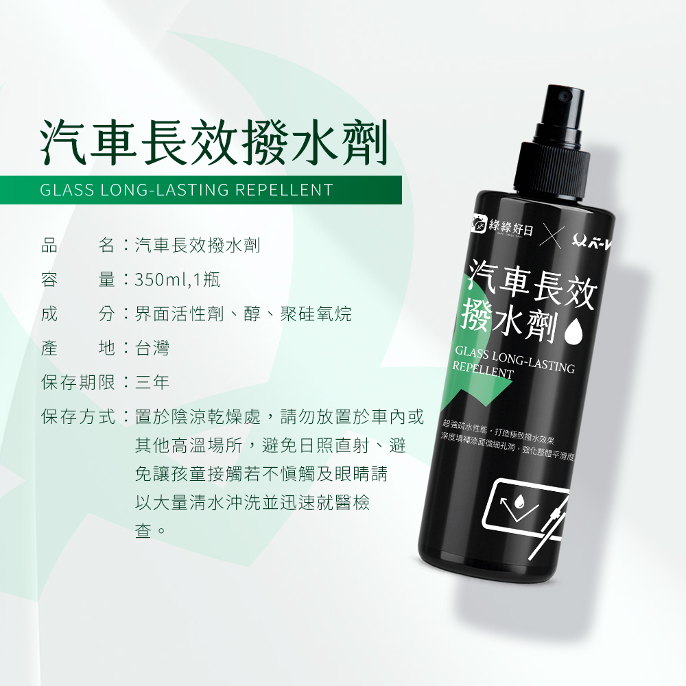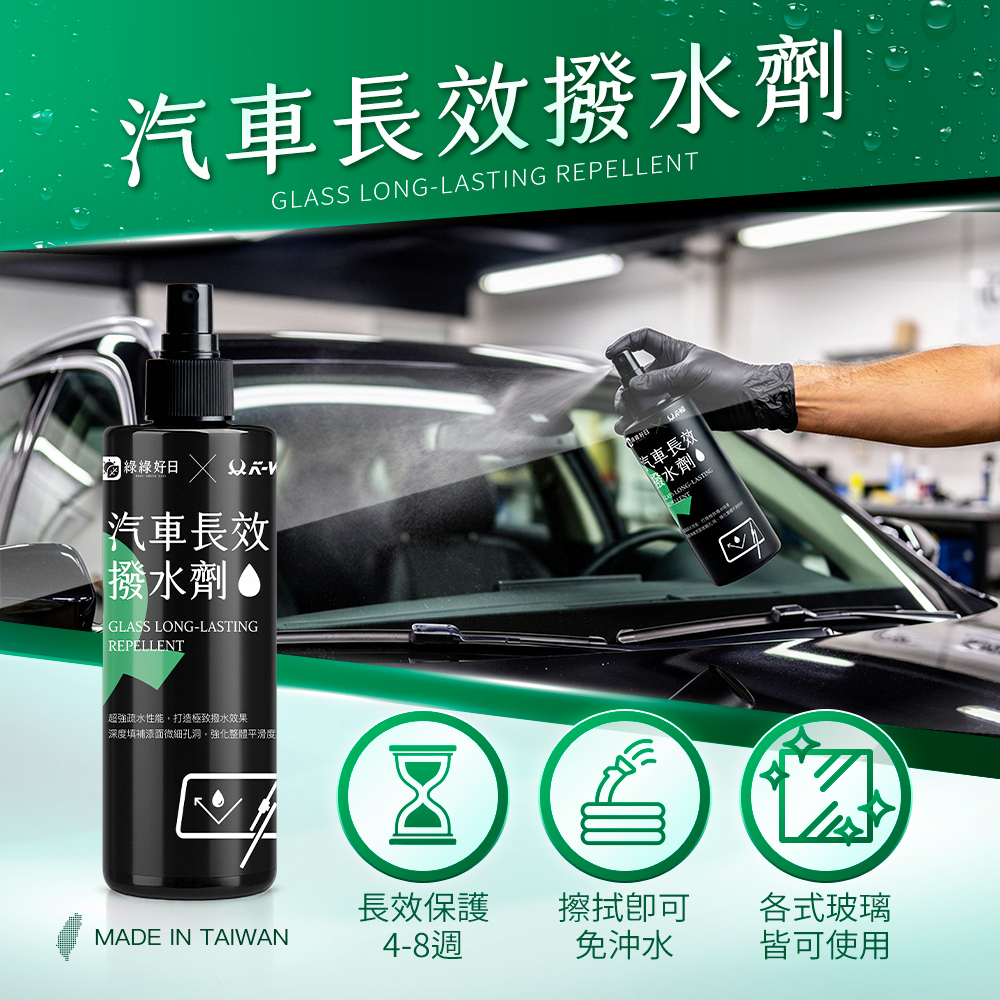 汽車保養的得意助手!快速形成疏水保護膜,雨水瞬間滑落不殘留,減少水漬與髒汙附著,行車視野更清亮、更安全。